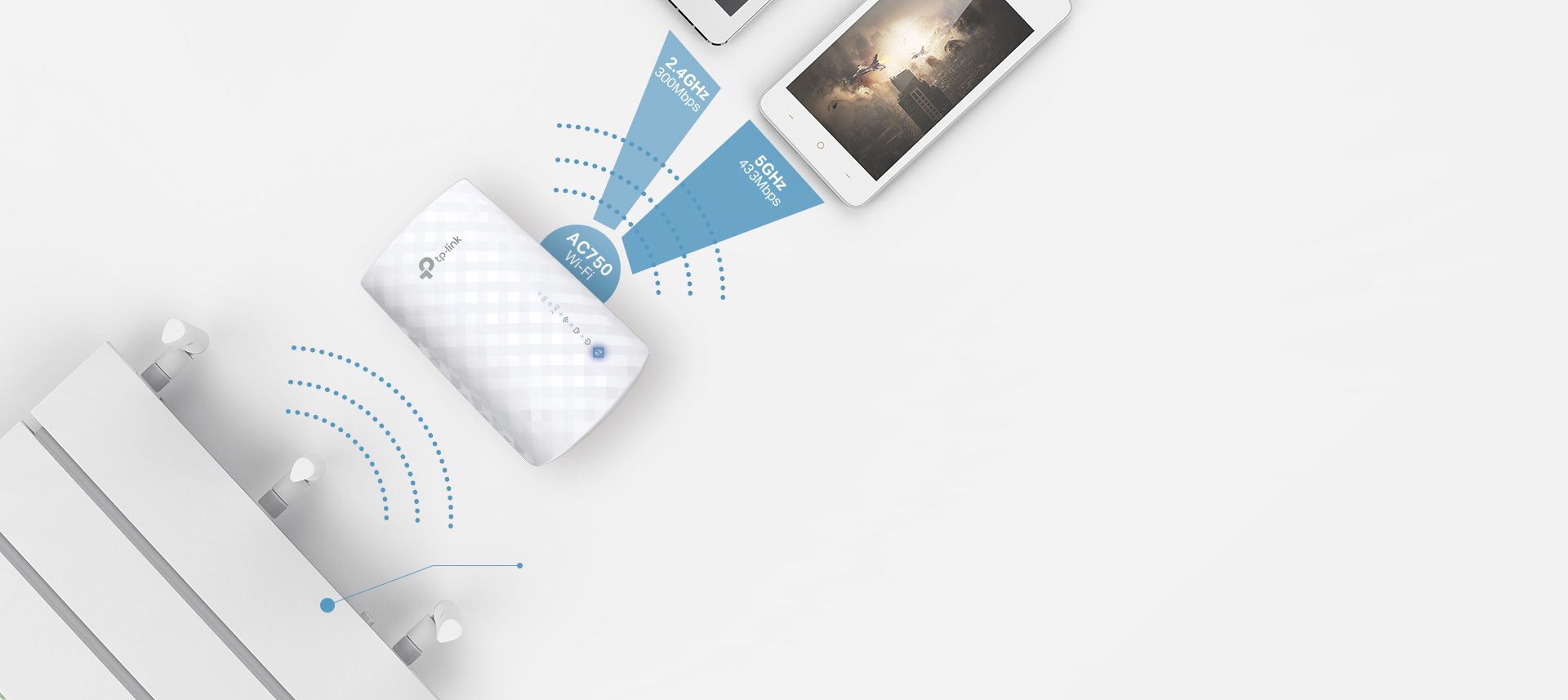 Технологія бездротового зв'язку AC підсилювача RE190 дозволяє насолоджуватися надійним з'єднанням по всьому будинку. Крім того, пристрій сумісний з усіма стандартними маршрутизаторами або точками доступу, тому забезпечення стабільного дводіапазонного бездротового з'єднання з декількома пристроями одночасно не становить жодних проблем.