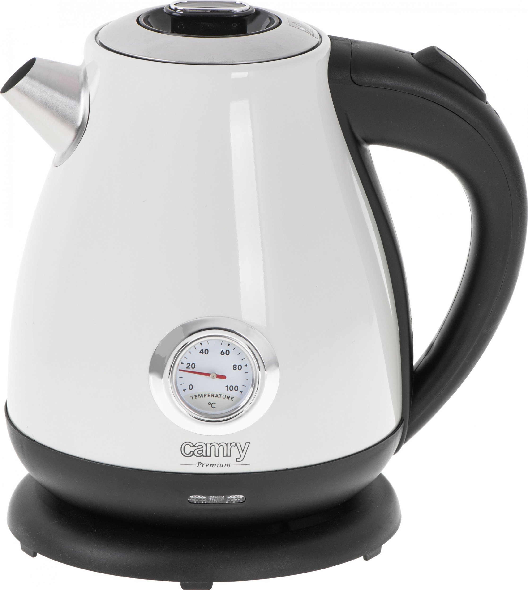 Класичний електричний чайник об'ємом 1,7 літра з термометром стане в нагоді на будь-якій кухні. Його безпека забезпечується блокуванням, що запобігає увімкненню порожнього чайника, та автоматичним вимкненням після закипання води. Функціональність підвищується завдяки стійкій підставці та зручному для читання індикатору рівня води. Він має максимальну потужність 2200 Вт і виготовлений з нержавіючої сталі, що робить його чемпіоном зі швидкого кип'ятіння води. Аналоговий індикатор температури води та витончена форма доповнять інтер'єр приміщення, оформленого в будь-якому стилі.