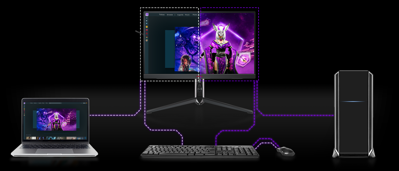 Функція Picture by Picture (PbP) дозволяє одночасно використовувати кілька джерел зображення (наприклад, ноутбук і настільний комп'ютер) і виводити зображення з цих джерел на один екран. Така велика область зображення забезпечує кращий контроль і значно підвищує продуктивність, покращує ігрову продуктивність і дозволяє більш комфортно переглядати інтернет-контент.