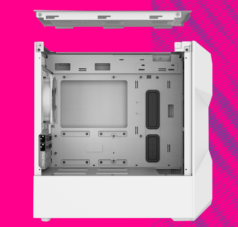 Верхня панель повністю знімається для кращого доступу до компонентів під час встановлення. Простота використання також полегшує встановлення систем охолодження, таких як вентилятори та радіатори.
