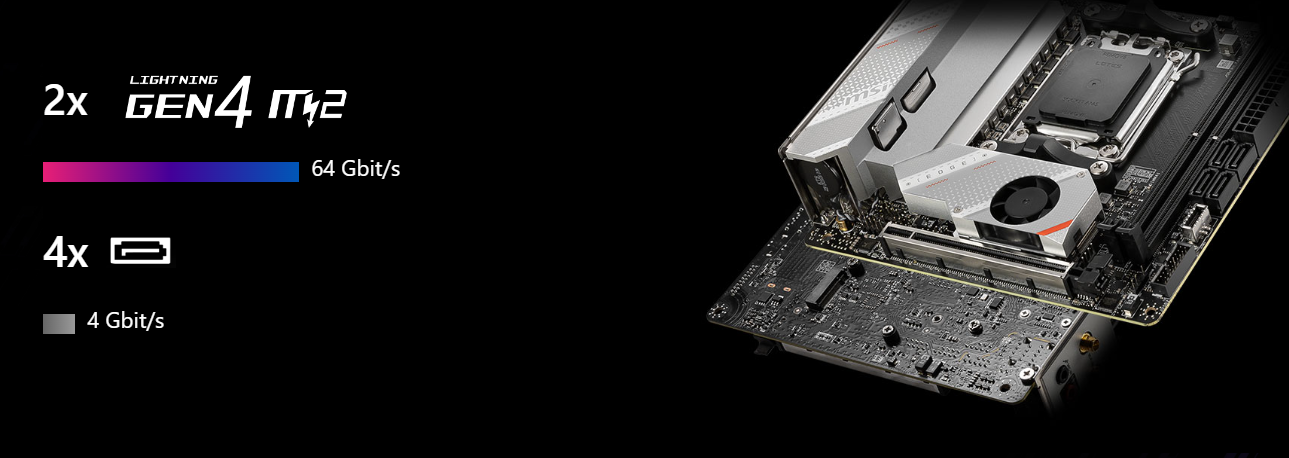 - Система охолодження M.2 Shield Frozr: Завдяки дворядному шарикопідшипнику вентилятор забезпечує безпеку твердотільних накопичувачів M.2, запобігаючи ефекту теплового дроселювання, що знижує їхню продуктивність, завдяки чому вони працюють швидше.