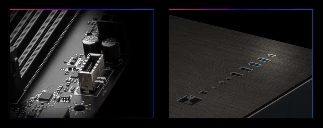 Ігрові материнські плати MSI оснащені передніми роз'ємами USB Type-C, що дозволяють геймерам підключати новітні USB-пристрої. Зберіть свій комп'ютер, використовуючи корпуси MSI для ПК, щоб отримати максимальну зручність роботи.