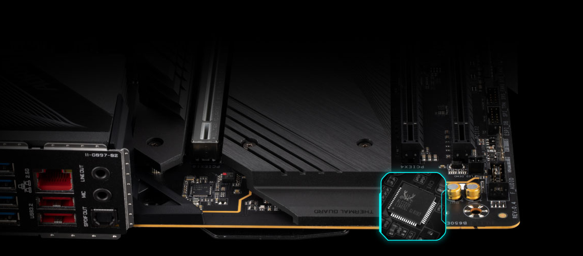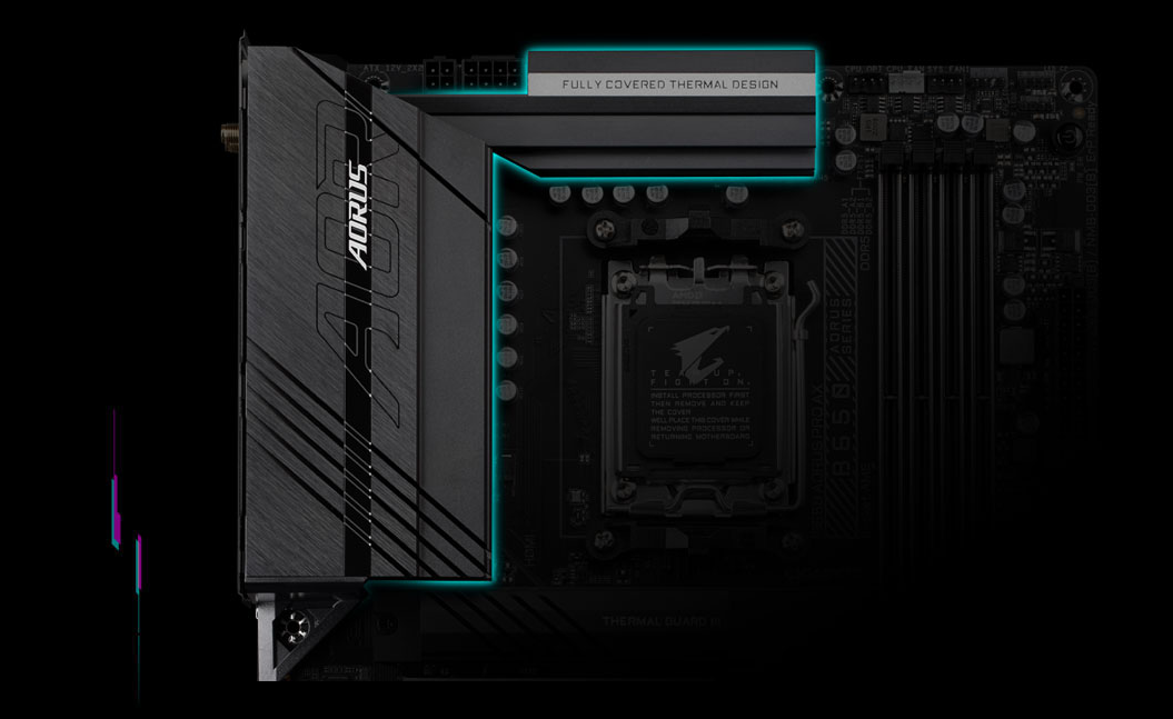 M.2 Thermal Guard III з 9-кратно оптимізованою площею розсіювання тепла для запобігання дроселюванню та утворенню вузьких місць, які можуть спричинити високошвидкісні твердотільні накопичувачі PCIe 5.0 M.2, особливо під високим навантаженням. Спеціальна конструкція канавок радіатора, спрямованих до центрального процесора, ще більше покращує потік повітря в корпусі та оптимізує конвекцію тепла.