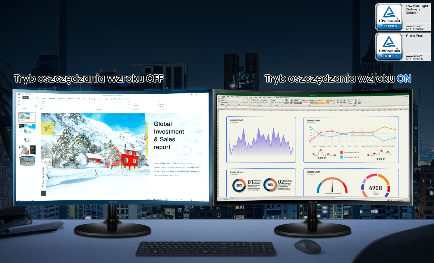 Бережіть свої очі та уникайте перенапруження! Удосконалена технологія Eye Saver, сертифікована TUV, зменшує навантаження на очі, мінімізуючи кількість випромінюваного синього світла, а функція Flicker Free усуває дратівливе мерехтіння екрана.