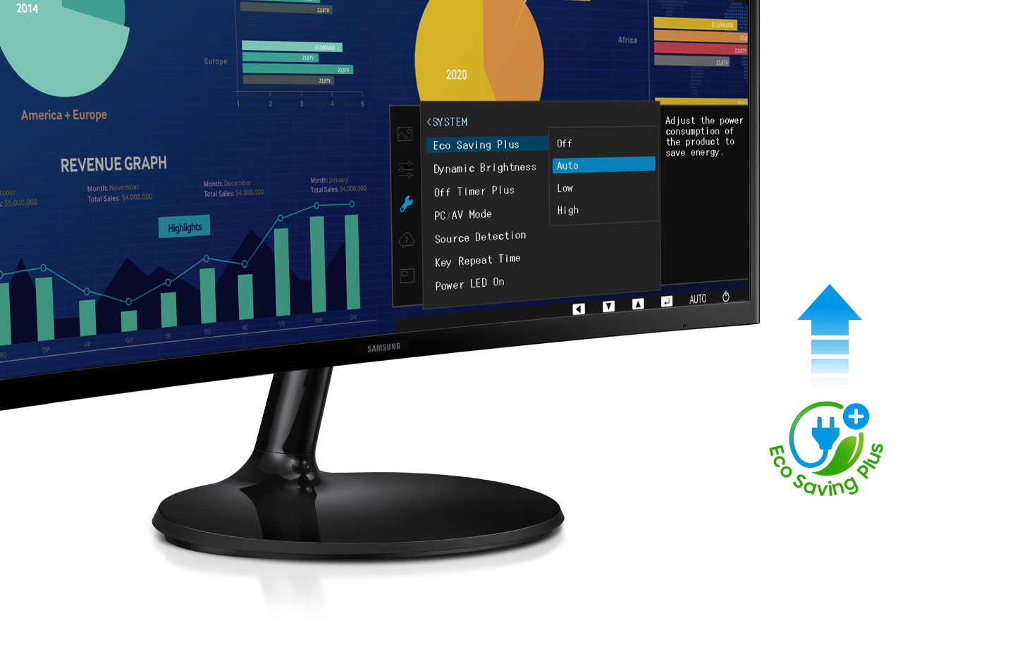 Монітор Samsung з глобальною сертифікацією енергоефективності має функції, які заощаджують енергію та піклуються про навколишнє середовище. Режим Eco Saving Plus автоматично регулює яскравість екрана, заощаджуючи до 10 % енергії.