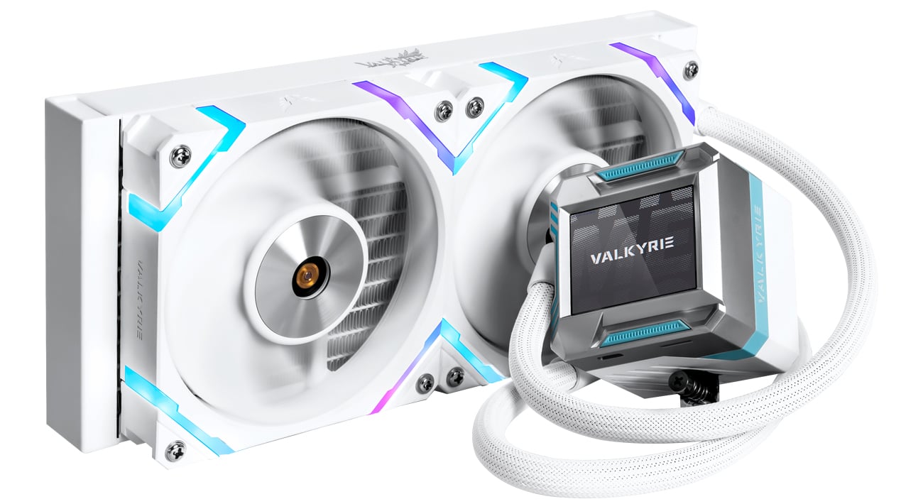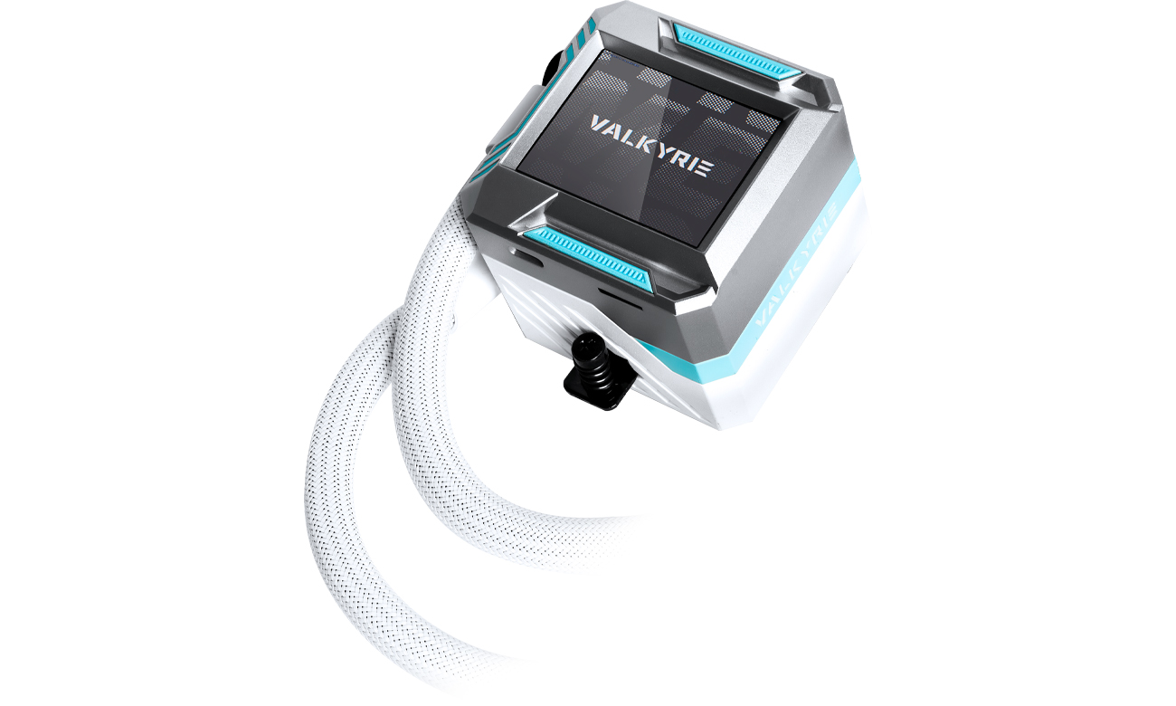 Valkyrie Syn 240 має вбудоване адресне світлодіодне підсвічування RGB. Незалежно від вашого настрою, ви можете налаштувати зовнішній вигляд кулера на свій смак за допомогою програмного забезпечення Valkyrie Control або програмного забезпечення виробника материнської плати за допомогою розгалужувача Valkyrie, що входить до комплекту поставки. Він дозволяє підключити до трьох вентиляторів, що полегшує організацію кабелів всередині корпусу. РК-дисплей, інтегрований в блок-помпу, дозволить вам відстежувати температуру, відображати фотографії та завантажувати анімацію.