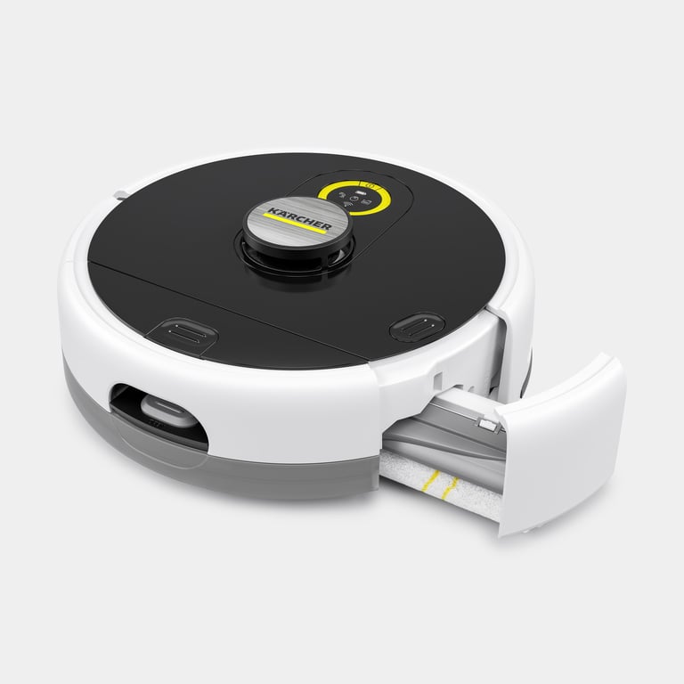 Kärcher RCF 3, колір: чорний, білий, форма: кругла. Місткість для пилу (загальна): 1,15 л, Об'єм резервуара для води: 0.43 л, Тип навігації: LiDAR. Технологія акумулятора: Літій-іонна (Li-Ion), Ємність акумулятора: 5200 мАг, Час роботи: 120 хв. Діаметр: 34 см, Висота виробу: 120 мм, Вага виробу: 4.5 кг. Вага з упаковкою: 7.2 кг, Тип упаковки: Коробка