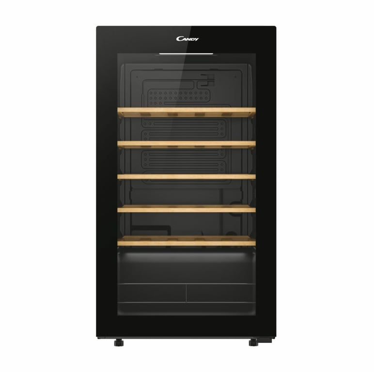 Candy DiVino CWC034. Положення приладу: Окремостоячий, колір корпусу: чорний, внутрішній колір: чорний. Місткість пляшок: 34 пляшки, Температурний діапазон (зона 1): 5 - 20 °C, Кліматичний режим: N-ST. Тип управління: Сенсорне, Тип лампи: світлодіодна, Підтримує програми керування: hOn. Клас енергоефективності: G, Річне енергоспоживання: 140 кВт-год, Шкала енергоефективності: Від A до G. Ширина виробу: 475 мм, Глибина виробу: 456 мм, Висота виробу: 850 мм