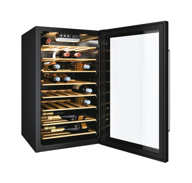 Candy CWC 154 EEL/NF. Вбудовування: Окремостоячий, колір корпусу: чорний, внутрішній колір: чорний. Місткість для пляшок: 41 пляшка, Температурний діапазон (зона 1): 7 - 18 °C, Кліматичний режим: N-ST. Тип управління: Кнопки, Тип дисплея: Світлодіодний, Розташування дисплея: Внутрішній. Клас енергоефективності: G, Річне енергоспоживання: 143 кВт-год, Шкала енергоефективності: Від A до G. Ширина виробу: 490 мм, глибина виробу: 545 мм, висота виробу: 845 мм