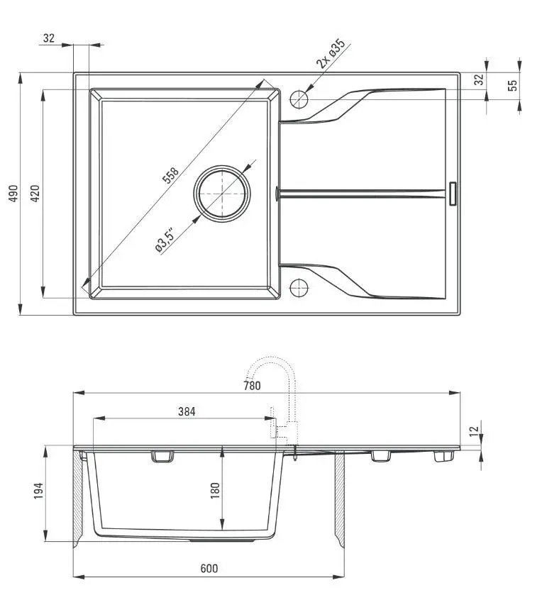 Розміри мийки (Ш х Г)780 х 490 мм