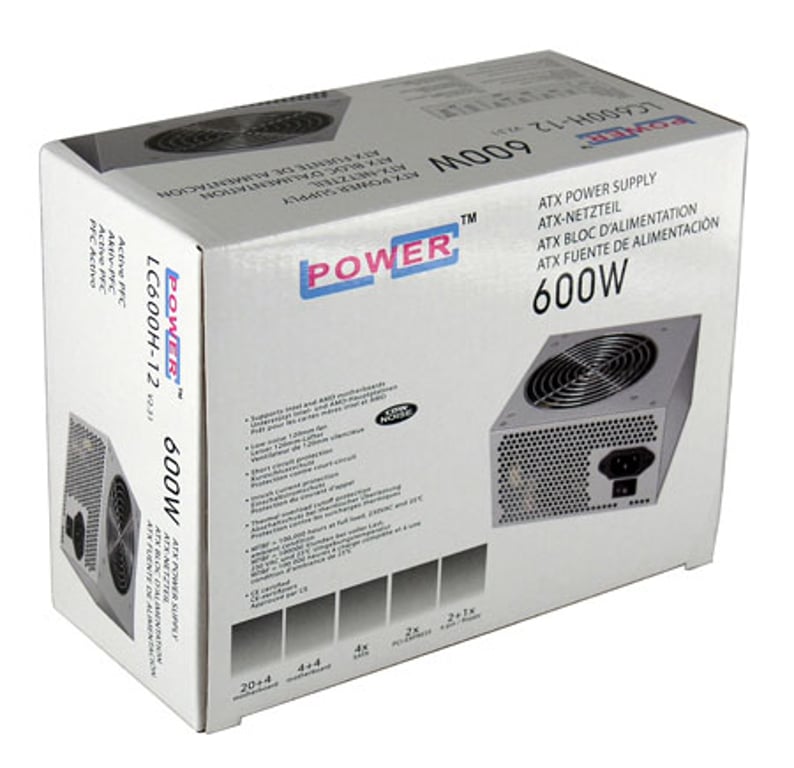LC-Power LC600H-12 V2.31 Загальна потужність: 600 Вт, тип PFC (Power Factor Correction): Активний, Максимальний вихідний струм (+3.3В): 24 A. Роз'єм живлення материнської плати: 20+4 pin ATX. Застосування: ПК, Тип блоку живлення (БЖ): ATX, Сертифікація: CE. Колір продукту: чорний, Тип охолодження: Активне, Діаметр крильчатки вентилятора: 12 см. Ширина виробу: 150 мм, Глибина виробу: 140 мм, Висота виробу: 86 мм