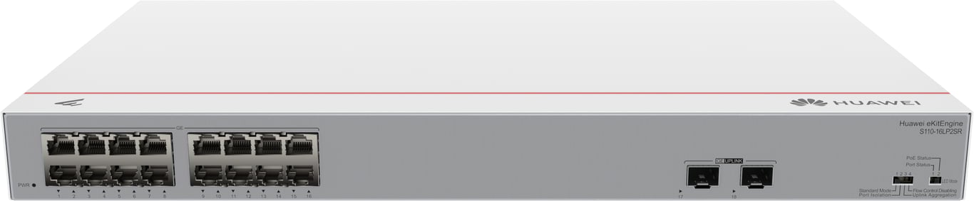 Huawei CloudEngine S110-16LP2SR. Базові комутаційні порти Ethernet RJ-45 Тип: Gigabit Ethernet (10/100/1000), базова комутація RJ-45 Кількість портів Ethernet: 16, підтримка PoE. Можливість монтажу в стійку, Компонування: 1U