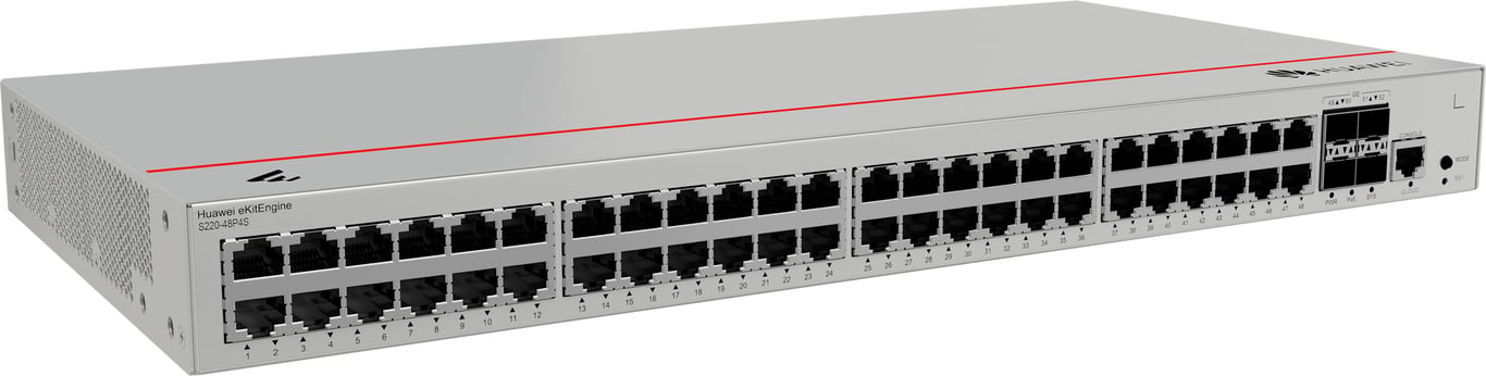 Huawei S220-48P4S. Основні комутаційні порти Ethernet RJ-45 Тип портів: Gigabit Ethernet (10/100/1000), Основні комутаційні RJ-45 Кількість портів Ethernet: 48, Кількість встановлених SFP модулів: 4, Консольний порт: RJ-45, Підтримка PoE. Можливість монтажу в стійку, Компонування: 1U