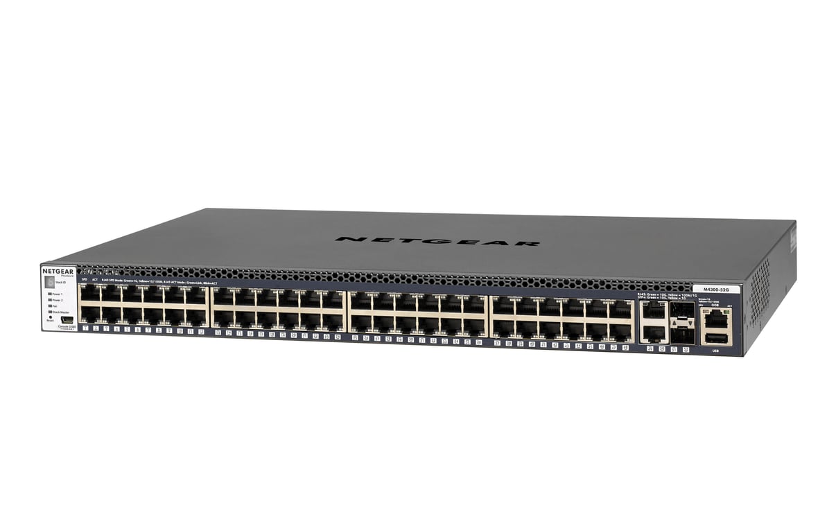 NETGEAR M4300-52G. Тип комутатора: Керований, багаторівневий Комутатор: L3. Базові комутаційні порти Ethernet RJ-45 Тип портів: Gigabit Ethernet (10/100/1000), Базові комутаційні RJ-45 Кількість портів Ethernet: 50, Кількість портів USB 2.0: 1, Консольний порт: RS-232, Пропускна здатність маршрутизації/комутації: 176 Гбіт/с. Роз'єм живлення: DC-in роз'єм. Можливість монтажу в стійку, Компонування: 1U