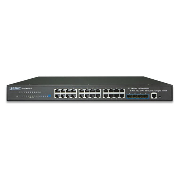 PLANET SGS-6341-24T4X. Тип комутатора: Керований, багаторівневий комутатор: L3. Основні комутаційні порти Ethernet RJ-45 Тип портів: Gigabit Ethernet (10/100/1000), Основні комутаційні RJ-45 Кількість портів Ethernet: 24, Консольний порт: RJ-45, Повнодуплексний. Розмір адресної таблиці: 16000 записів, Пропускна здатність маршрутизації/комутації: 128 Гбіт/с. Стандарти зв'язку: IEEE 802.1D, IEEE 802.1Q, IEEE 802.1ab, IEEE 802.1p, IEEE 802.1s, IEEE 802.1w, IEEE 802.1x, IEEE..... Можливість монтажу в стійку, компонування: 1U