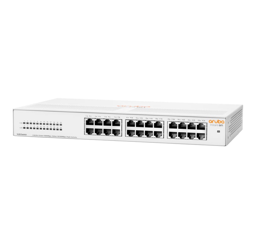 Aruba Instant On 1430 24G. Тип комутатора: Некерований, багаторівневий комутатор: L2. Базові комутаційні порти Ethernet RJ-45 Тип: Gigabit Ethernet (10/100/1000), Базові комутаційні RJ-45 Кількість портів Ethernet: 24, повний дуплекс. Розмір адресної таблиці: 8192 записи, Пропускна здатність маршрутизації/комутації: 48 Гбіт/с. Стандарти зв'язку: IEEE 802.3, IEEE 802.3ab, IEEE 802.3az, IEEE 802.3i, IEEE 802.3u, IEEE 802.3x, IEEE 802.3z. Можливість монтажу в стійку, компонування: 1U