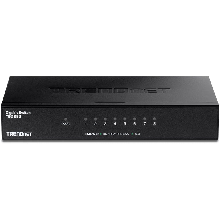 Trendnet TEG-S83. Базові комутаційні порти Ethernet RJ-45 Тип: Немає, Базові комутаційні RJ-45 Кількість портів Ethernet: 8, Full duplex. Розмір адресної таблиці: 4000 записів, Пропускна здатність маршрутизації/комутації: 16 Гбіт/с. Стандарти зв'язку: IEEE 802.3, IEEE 802.3ab, IEEE 802.3u, IEEE 802.3x. Вхідна напруга постійного струму: 5 В