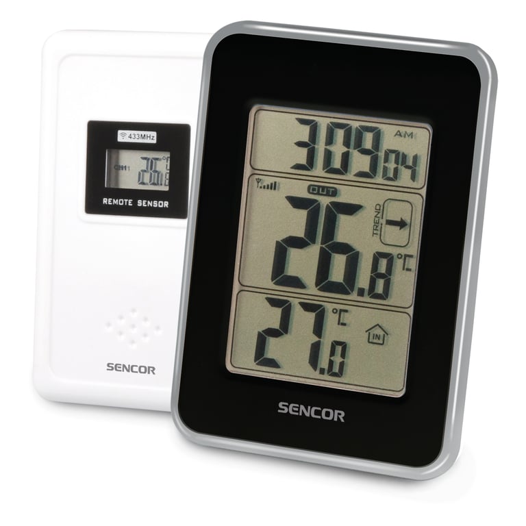 Sencor SWS 25 BS. Колір виробу: Чорний, Сріблястий, Функції вимірювання: Термометр в приміщенні, Зовнішній термометр, Відображення тренду функції вимірювання: Термометр. Тип батареї: AAA, AA, Напруга батареї: 1,5 V. Ширина виробу: 76 мм, Глибина виробу: 36 мм, Висота виробу: 106 мм