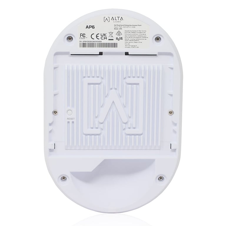 Alta Labs AP6. 2,4 ГГц, 5 ГГц, Максимальна швидкість передачі даних: 3000 Мбіт/с. Шифрування/безпека: WPA-Enterprise, WPA-PSK, WPA2, WPA3. Швидкість передачі даних по локальній мережі Ethernet: 100,1000 Мбіт/с. Підтримка PoE. Колір виробу: білий. Максимальна споживана потужність: 20 W