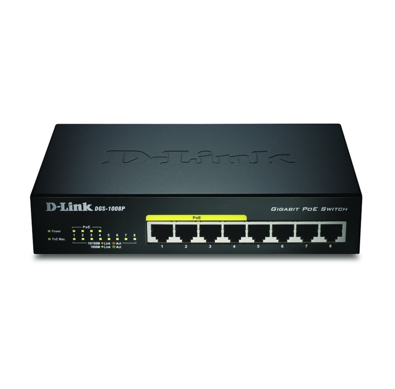 D-Link DGS-1008P/E. Тип комутатора: Некерований, Багаторівневий комутатор: L2. Базова комутація RJ-45 Кількість портів Ethernet: 8. повний дуплекс. Розмір адресної таблиці: 4000 записів, Пропускна здатність маршрутизації/комутації: 16 Гбіт/с. Стандарти зв'язку: IEEE 802.1p, IEEE 802.3, IEEE 802.3ab, IEEE 802.3af, IEEE 802.3u, IEEE 802.3x. Роз'єм живлення: Гніздо постійного струму. Підтримка PoE