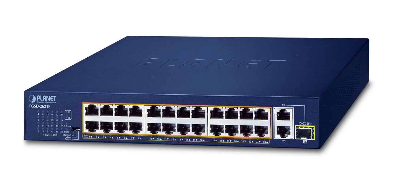 PLANET 24-портовий 10/100TX 802.3at PoE. Тип комутатора: Некерований. Базові комутаційні порти Ethernet RJ-45 Тип портів: Gigabit Ethernet (10/100/1000), Базові комутаційні RJ-45 Кількість портів Ethernet: 26, Кількість встановлених SFP модулів: 1, Розмір адресної таблиці: 16000 записів, Пропускна здатність маршрутизації/комутації: 8.8 Гбіт/с. Стандарти зв'язку: IEEE 802.3, IEEE 802.3ab, IEEE 802.3af, IEEE 802.3at, IEEE 802.3az, IEEE 802.3u, IEEE 802.3x, IEEE.... Підтримка PoE Можливість монтажу в стійку, компонування: 1U