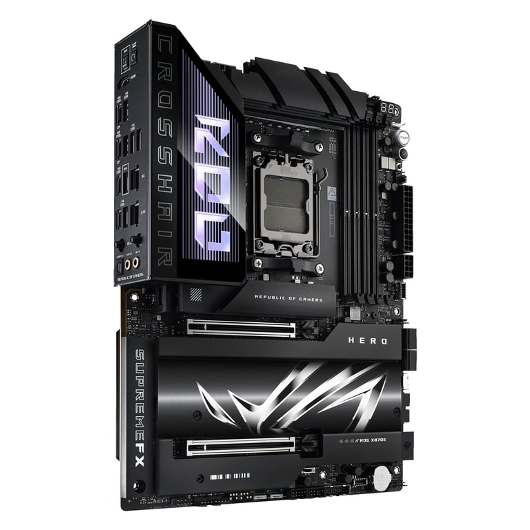 ASUS ROG CROSSHAIR X870E HERO. Виробник процесора: AMD, Сокет процесора: сокет AM5, Підтримувані сокети процесора: сокет AM5. Підтримувані типи пам'яті: DDR5-SDRAM, Максимальний об'єм пам'яті: 192 ГБ, Тип слота пам'яті: DIMM. Підтримувані інтерфейси жорстких дисків: M.2, SATA III, SlimSAS, Підтримувані типи дисків: HDD і SSD, Рівні Rid: 0, 1, 10, 5, Тип інтерфейсу Ethernet: 2.5 Gigabit Ethernet, 5 Gigabit Ethernet, Базовий стандарт Wi-Fi: Wi-Fi 7 (802.11be), Стандарти Wi-Fi: Wi-Fi 7 (802.11be). Застосування: ПК, Тип плати: ATX, Сімейство плат на чіпсеті: AMD