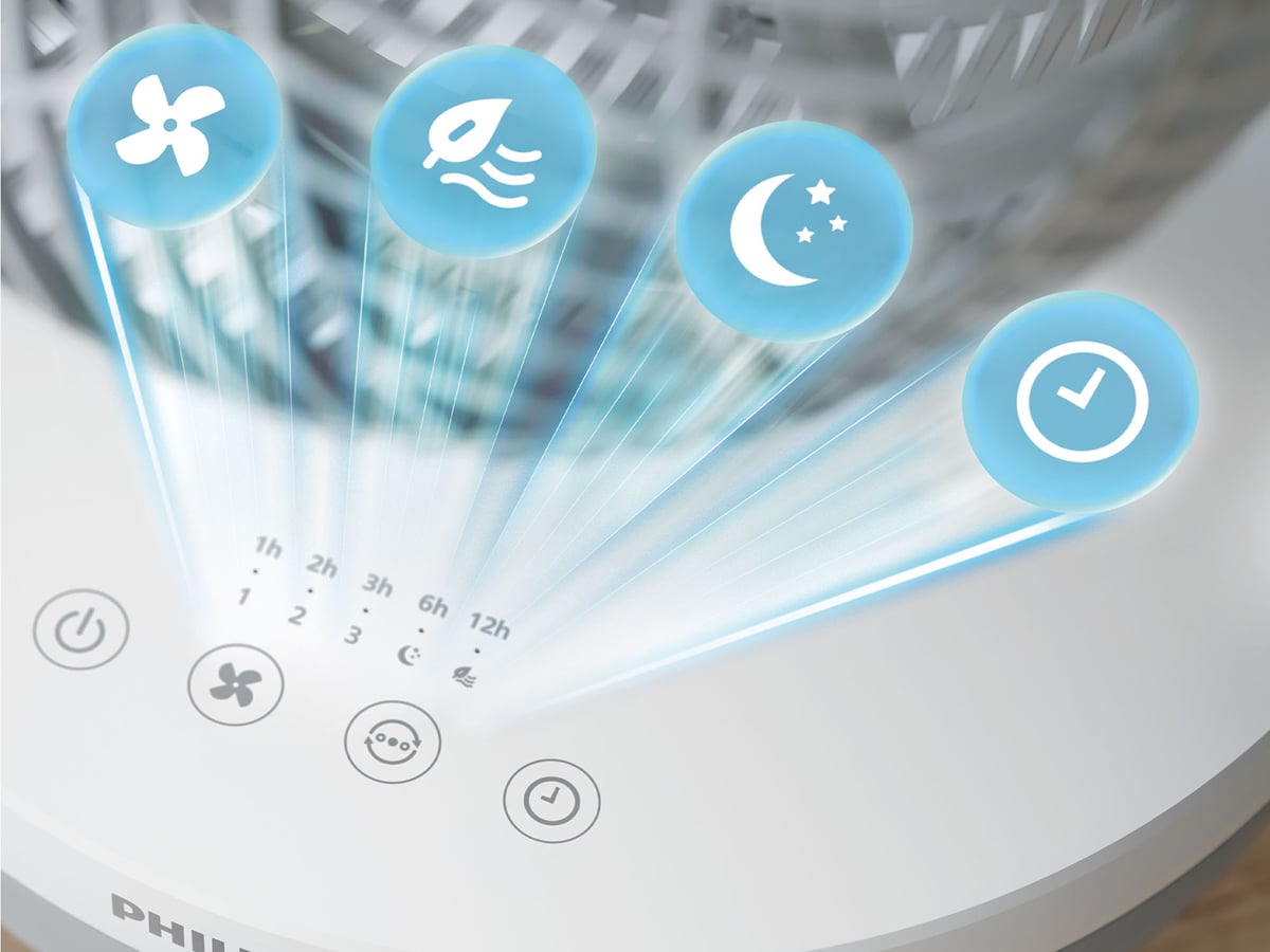 Philips CX2050/00 оснащений інтуїтивно зрозумілою сенсорною панеллю, яка перетворює керування пристроєм на дитячу гру. Ви можете вибрати одну з трьох швидкостей відповідно до ваших потреб. Ви також можете скористатися функцією «Природний бриз» або «Нічний», щоб забезпечити собі комфорт у будь-який час доби. Крім того, вентилятор має функцію таймера, тож ви самі встановлюєте час роботи. Коли таймер закінчиться, пристрій автоматично вимкнеться.
