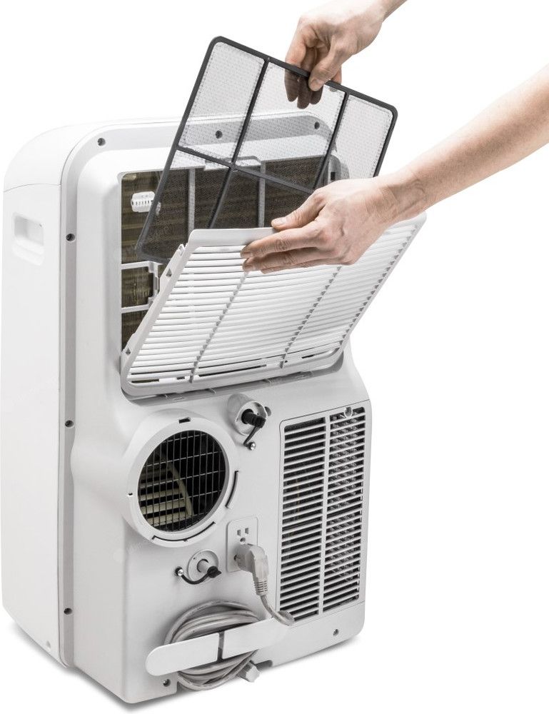 Функція таймера дозволяє заздалегідь встановити час, в який пристрій повинен вмикатися або вимикатися. За допомогою цієї функції ви можете, наприклад, заснути в свіжому, прохолодному приміщенні, і кондиціонер сам вимкнеться вночі. Напрямок повітря, що видувається, можна змінювати за бажанням відповідно до ваших потреб. Пристрій дуже простий в обслуговуванні. Повітряний фільтр легко знімається, і його очищення не становить жодних проблем. Повітряний фільтр ефективно затримує частинки пилу, волосся та інші великі забруднення. Кондиціонер використовує екологічно чистий холодоагент. Пристрій має функцію Swing, при якій потік охолоджуючого повітря рівномірно розподіляється в приміщенні за рахунок автоматичного руху вентилятора в одну і іншу сторону.