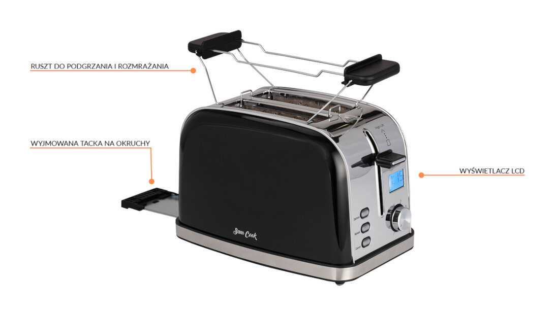 SAM COOK PSC-60 оснащений РК-дисплеєм. Він дозволяє контролювати етапи приготування їжі. На екрані ви можете прочитати точну інформацію про етап підсмажування і час, що залишився до повного приготування тостів.